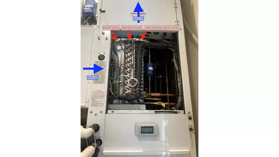 The basic operating principle of a dehumidifier is to remove water vapor from the air without overcooling the space. Dehumidifiers are designed to have longer compressor runtimes by immediately, after the evaporator coil, adding heat (“reheat”) back into the space. The cold evaporator coil, paired with the reheat coil work together to “wring out” as much moisture as possible without changing the temperature of the air.