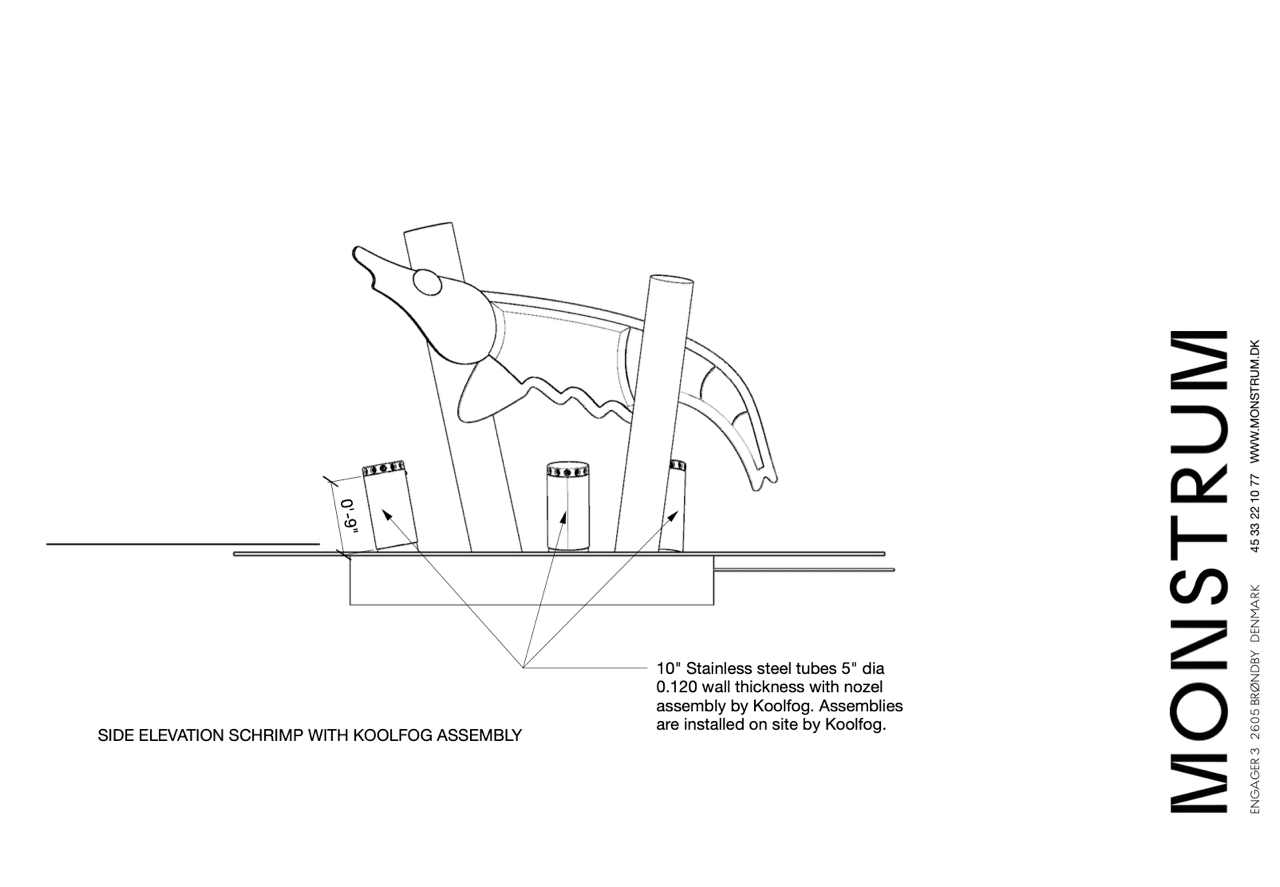Each fog pole integrates Koolfog nozzles, mounted flush to the pole tops, ensuring a seamless, low-lying fog effect that contributes to the visual illusion of an aquatic environment. Assembly and installation strategies were coordinated with Monstrum, to help facilitate accurate field execution with the installation contractor.