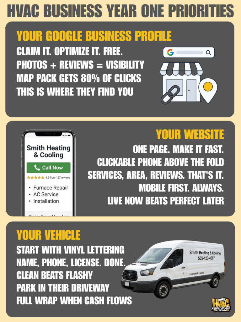 You’ve got a van, some tools, and limited cash to make this work. Someone says you need a wrapped truck to “look professional.” Your brother-in-law says website. Your old boss says both. Unfortunately, spending $4,000 on the wrong thing could mean running out of runway before you land your first 20 customers.