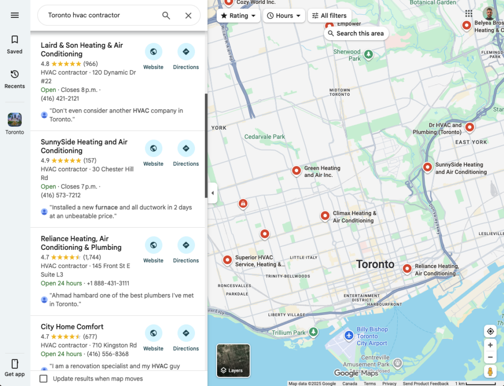 Google Business Profile (GBP) is where this battle is won or lost. When someone searches for HVAC services, Google displays a “Local Pack,” which is three businesses on a map at the top of results. Ninety-three percent of local searches show this pack.¹ If you’re not in those three spots, you might as well not exist. Claiming your GBP is free. Optimizing it costs maybe $300-500 in photos, review software, and citation cleanup. For that modest investment, you’re competing for high-intent customers actively looking to spend money, not hoping someone remembers your logo from traffic.