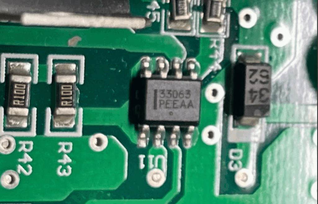 This means we must have another voltage regulator somewhere. If we look near the large 2200μF capacitor, we’ll notice a very small IC labeled “33063”. This is a switching regulator. Unlike linear regulators, which waste excess energy as heat, a switching regulator turns on and off rapidly to maintain the desired output voltage. The output voltage is determined by the value of two resistors forming a voltage divider circuit that is fed back to the comparator on pin 5. These devices tend to cost more, but they run much cooler and are far more efficient.