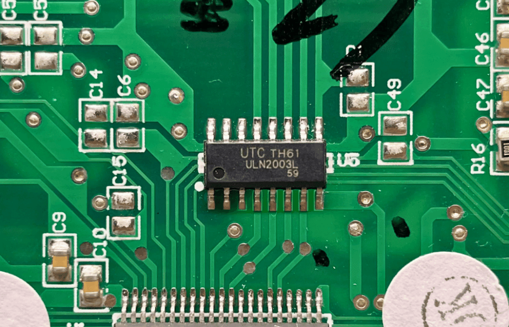 But how can a PCB relay with a 12VDC coil be switched ON/OFF by a microcontroller that can only handle a maximum of 5.5VDC? This is where the magic of the transistor comes into play. A Darlington transistor array known as a ULN2003 can be located just above the microcontroller.