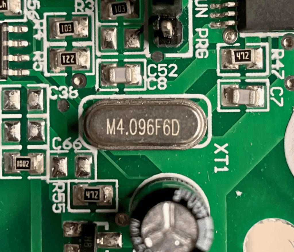 Right next to the microcontroller, there’s a small metal can marked M4.096F6D. This is a crystal oscillator. Its job is to keep the microcontroller running on a steady clock signal. The number tells us it runs at 4.096 MHz, which means it vibrates over four million times per second to keep everything in sync. The microcontroller uses that timing to run its program at the right speed and to make sure things like communication and internal timing stay accurate. Without it, the microcontroller would have no sense of timing and wouldn’t operate reliably.