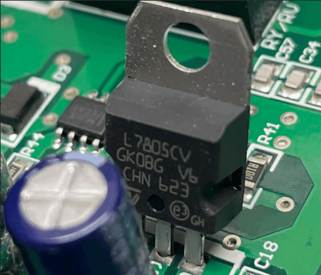 These relays have 12 VDC coils. On the back of the board, we can see by the PCB traces that the coils are powered from the same source as the input pin for our L7805 regulator.