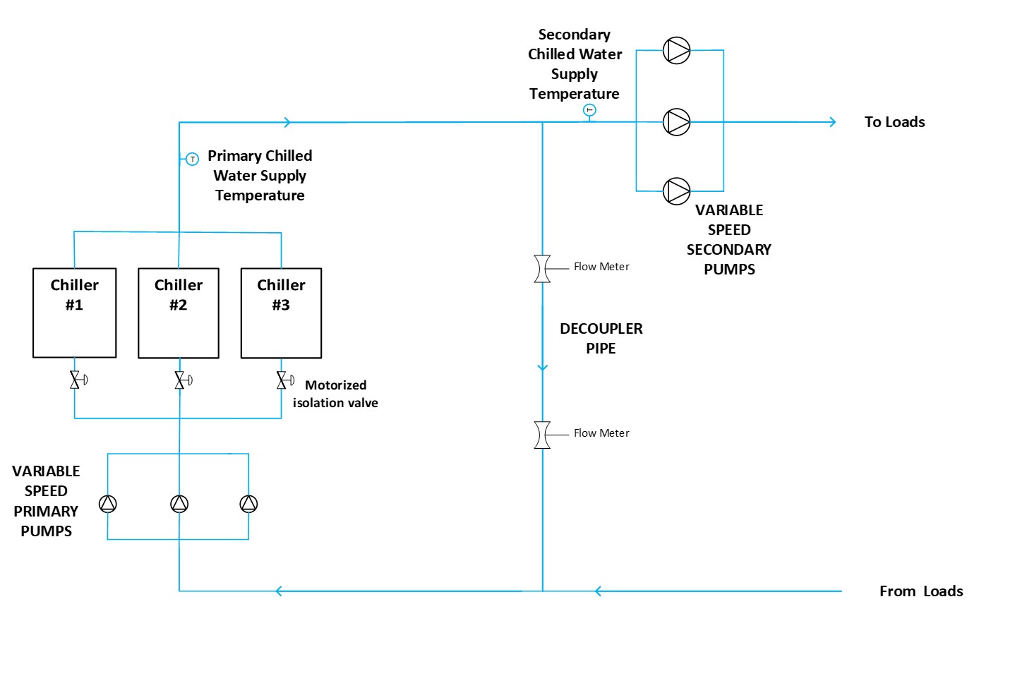 Figure 1 shows a schematic of a central chilled water plant I recently worked on. It was a variable speed primary / variable speed secondary system configuration. Cooling demand from served loads (AHUs, CRAC units, FCUs and process cooling applications) dictated the secondary flow. Flow meters in the decoupler pipe were used to control the primary pumps. Those primary pumps were staged and their speed modulated to maintain a positive 100 GPM of flow from the supply piping to the return piping, as measured by redundant flow meters in the decoupler pipe. Keeping flow in this direction ensures the appropriate secondary chilled water supply water temperature was consistently sent out to the served loads.