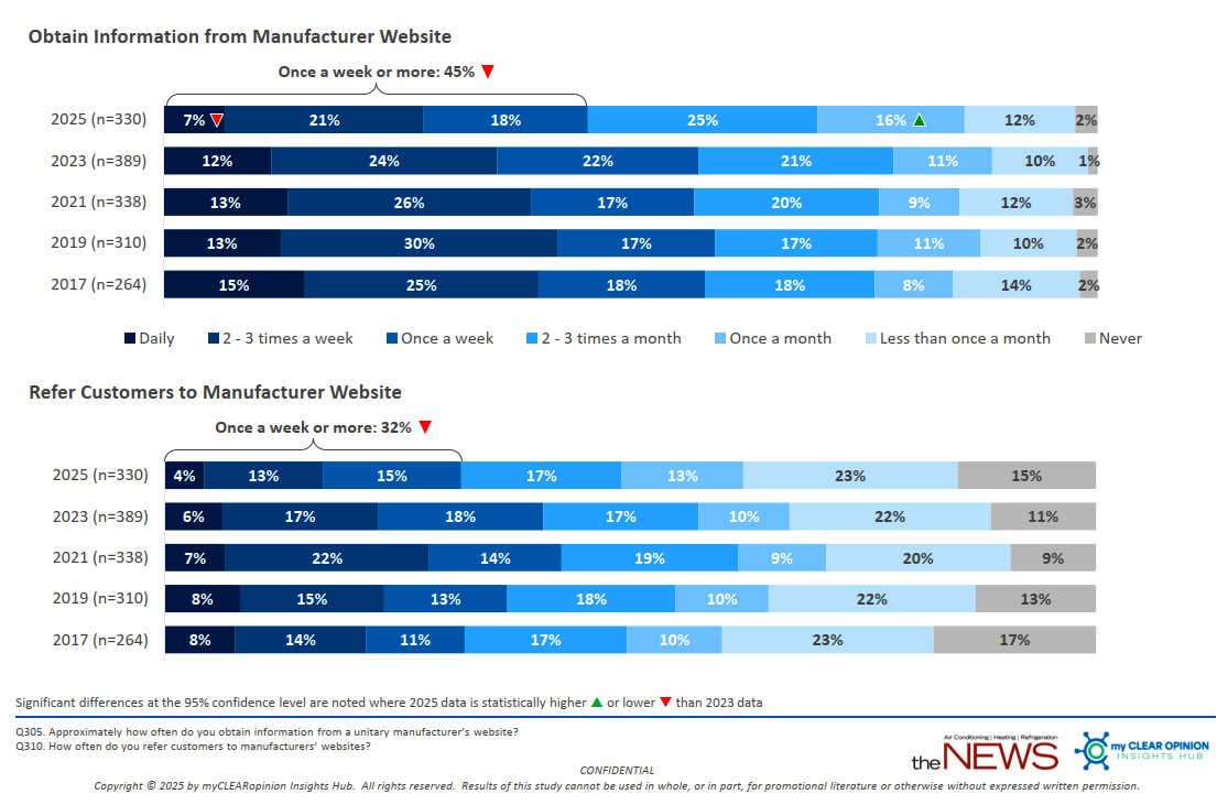 DIGITAL TOUCHPOINTS: More than 2 in 5 residential HVAC professionals obtain information from a manufacturer’s website on a weekly basis. By comparison, they refer their customers to manufacturer websites less often by comparison. (Courtesy of myCLEARopinion Insights Hub)